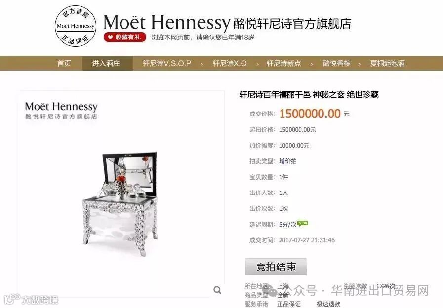 值得一提的是,这件艺术品一样的酒款离我们并不遥远。2017年酩悦轩尼诗集团入驻天猫时,便将一支Beauté du Siécle在天猫上拍卖,起拍价150万元人民币!而且最后还成交了!所以说,远的不是酒与我的距离,是15后面要跟多少个零。