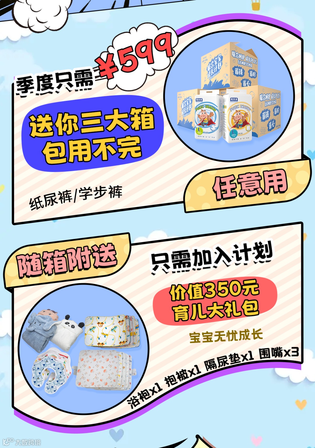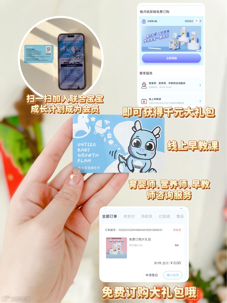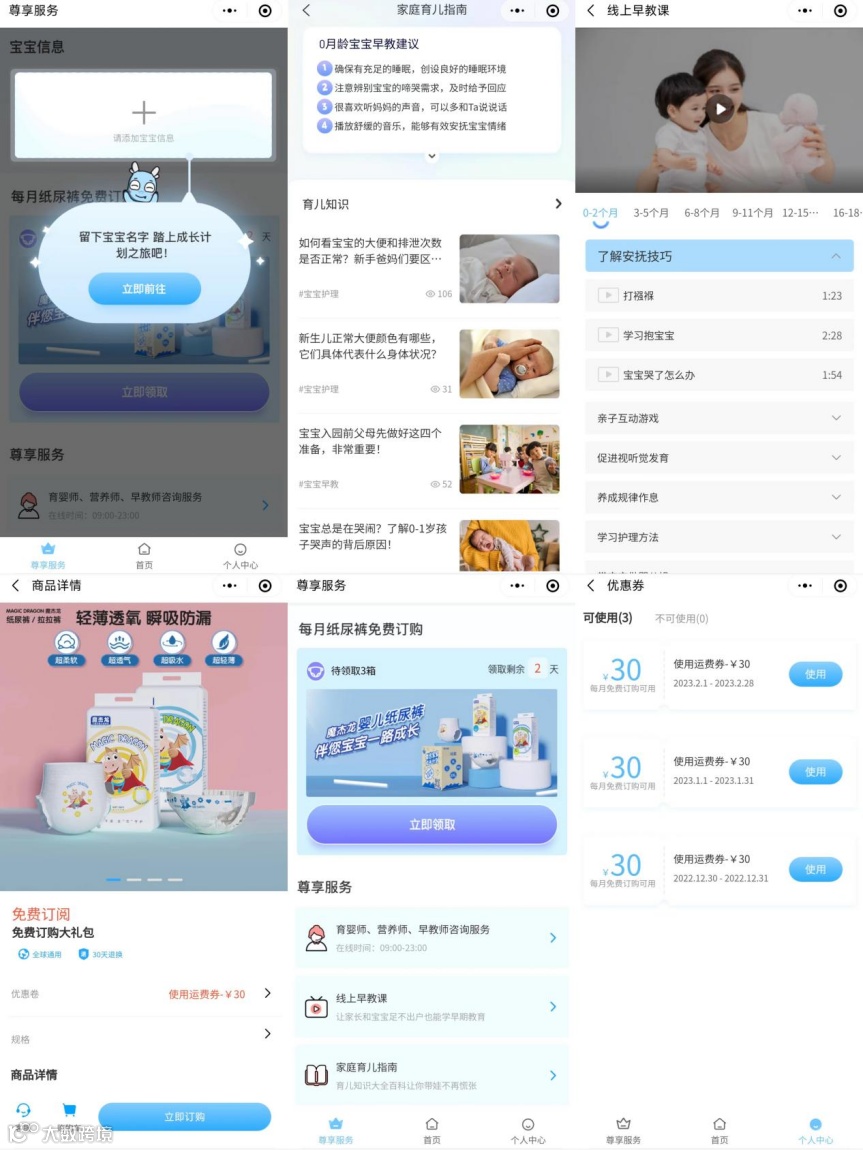 除了赠送纸尿裤外,👏加入会员还可以获得育儿礼包,✔️里面有抱被、洗脸巾、口水巾、隔尿裤等价值300元的宝宝用品,每一件都非常实用。