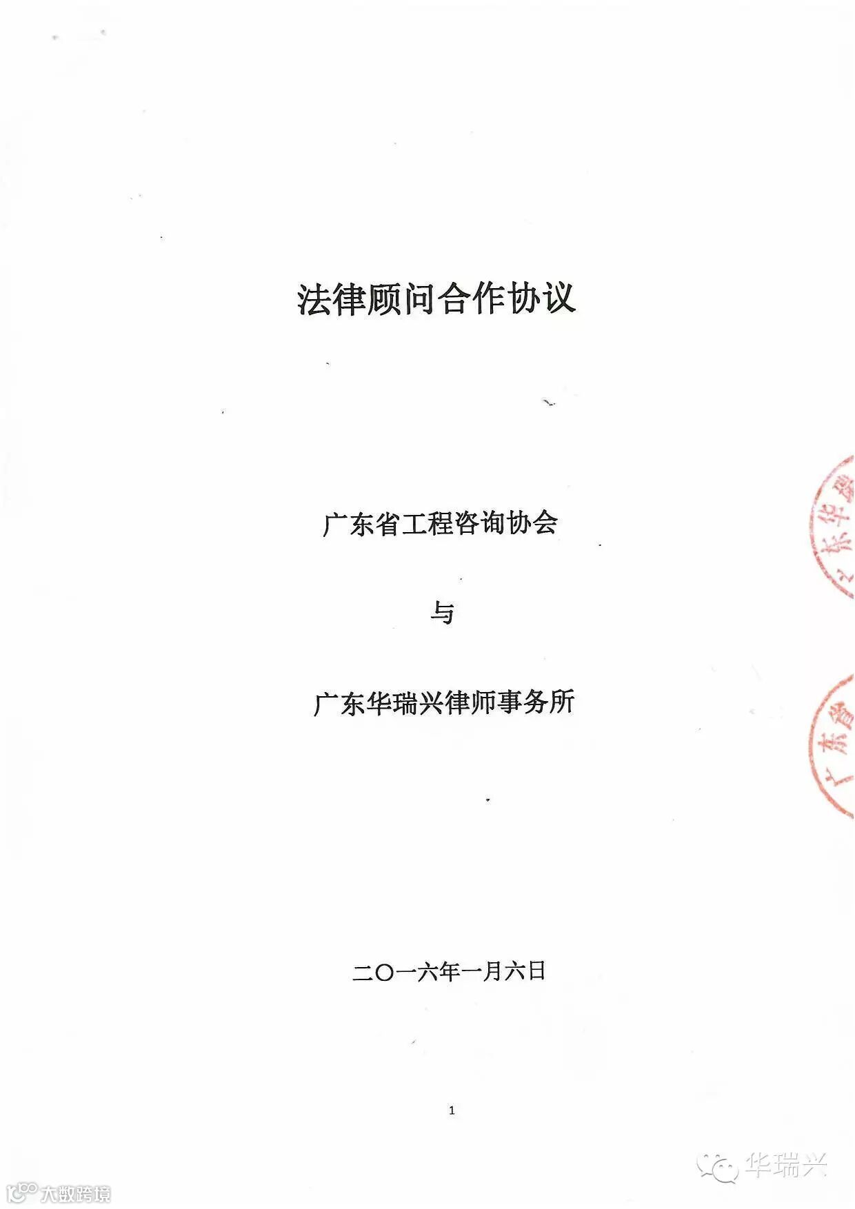 2016年1月6日,华瑞兴律师事务所正式与广东省工程咨询协会签订《法律顾问合作协议》。《法律顾问合作协议》的签订标志着华瑞兴律师事务所成为广东省工程咨询协会的法律顾问单位,同时,双方建立了PPP项目的合作。这次协议的签订有利于双方日后通过紧密的、长期的合作关系,实现PPP项目资源共享、优势互补,以及共同开展各类PPP项目。