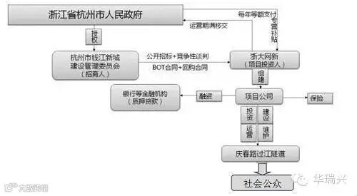 市政道路中的过江隧道采用BOT补贴模式进行建设的具体例子是杭州市庆春路过江隧道。该隧道建成后将穿过钱塘江连接杭州未来的行政中心——钱江新城和对岸的萧山区钱江世纪城,工程概算投资为20.96亿元,BOT合同约定庆春路过江隧道的建设期是3年,运营期是20年。具体的建设模式如下: