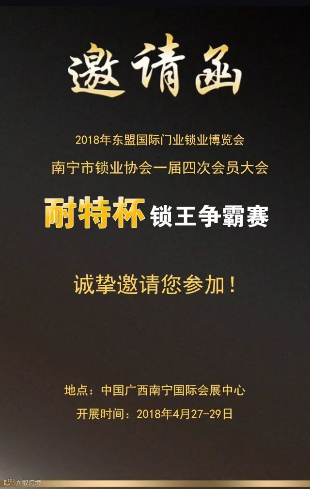 佛山市耐特锁业有限公司冠名的“耐特杯”锁王争霸赛,旨在提高全国锁匠的开锁技能方法和开锁工具使用知识,更好更快捷地为广大群众服务,同时也检验锁具的防盗安全能力水平,为各地厂家及时提供更专业、更有效的锁具安防设置及改善提升的综合意见而赞助,现向广大锁匠朋友们发出诚挚的邀请,名额有限,机不可失,失不再来!