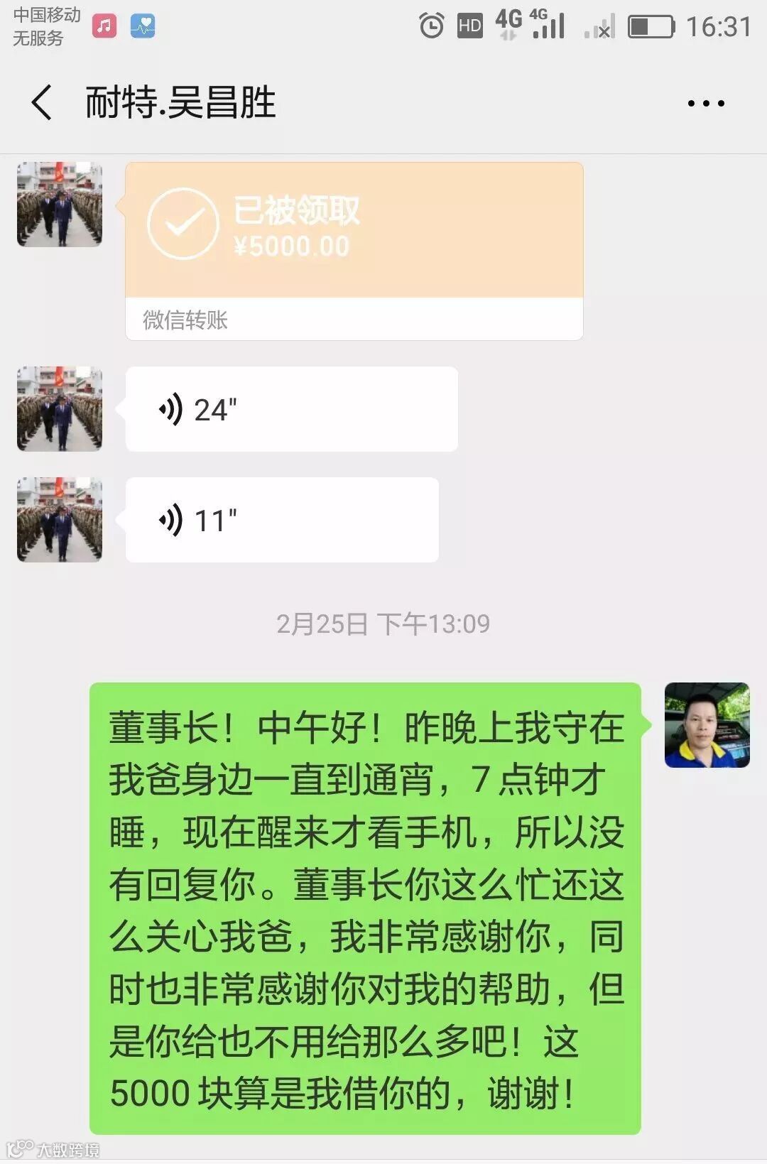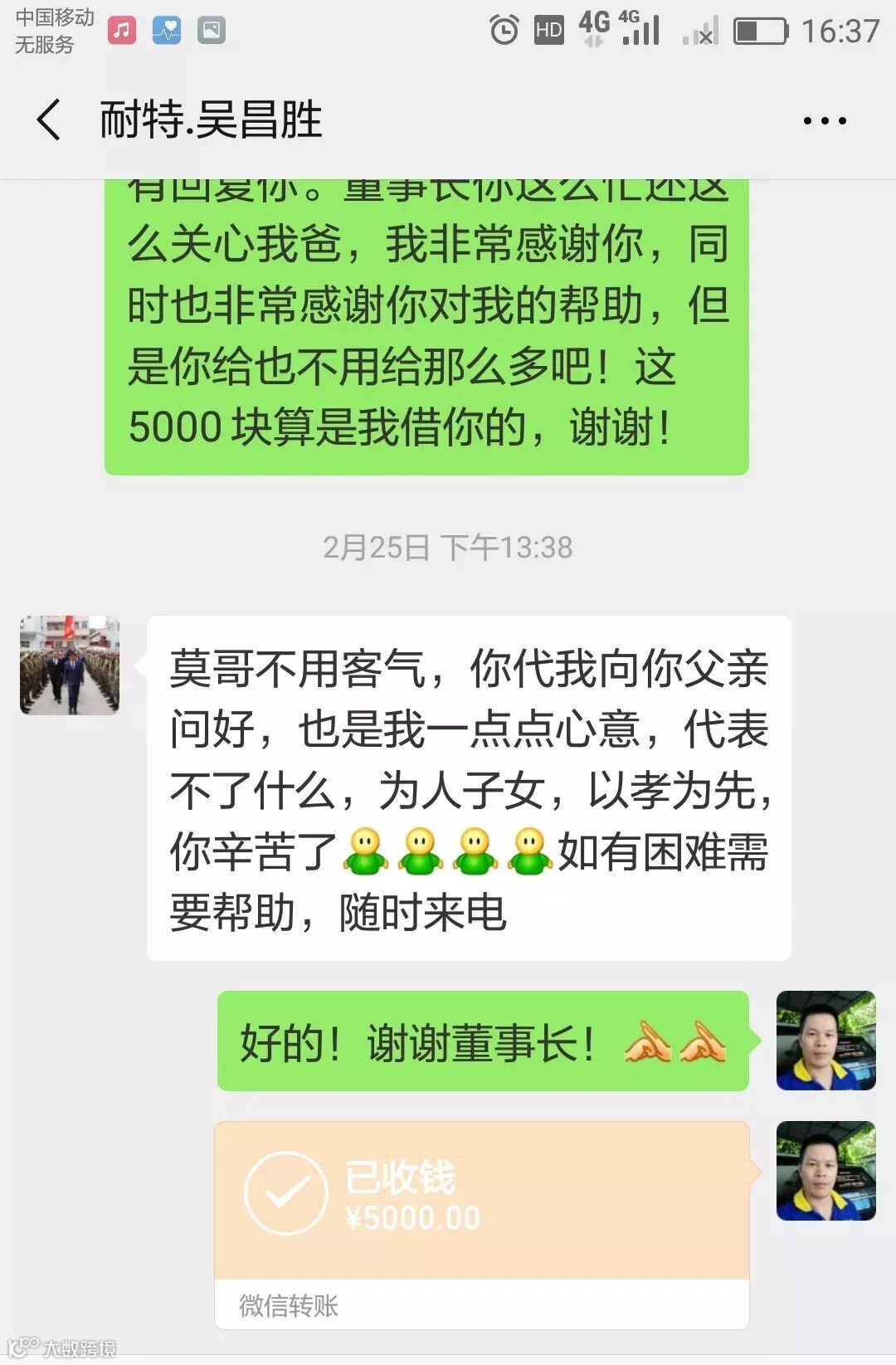 我爸在住院的过程中,我经常收到董事长,潘总以及公司领导亲情的问候和关心,当时我非常感动。特别是董事长和潘总,作为一个公司的老板,每天都那么忙,他们还能抽出宝贵的时间,不是发信息就是发语音问候我爸的病情,我感觉到他们是真正的关心我的家人,也把我当作自己的家人,当作兄弟一样。2月25日早上7:30分,我收到董事长的微信转账5000块,董事长用语音跟我说:他抽不出时间来看望我爸,只能给一点心意。当时的我感动得流下了眼泪,我不敢用语音跟董事长说话,我怕我忍不住会哭出来,只能发信息回复:“董事长!中午好!你那么忙还这么关心我爸,我非常感谢你,同时也非常感谢你对我的帮助,但是你不用给这么多,这5000块算是我借你的,谢谢!”董事长再次回复我:“莫哥不用客气,你代我向你父亲问好,这也是我一点点心意,代表不了什么,为人子女,以孝为先,辛苦了,如有困难需要帮助,随时来电”。