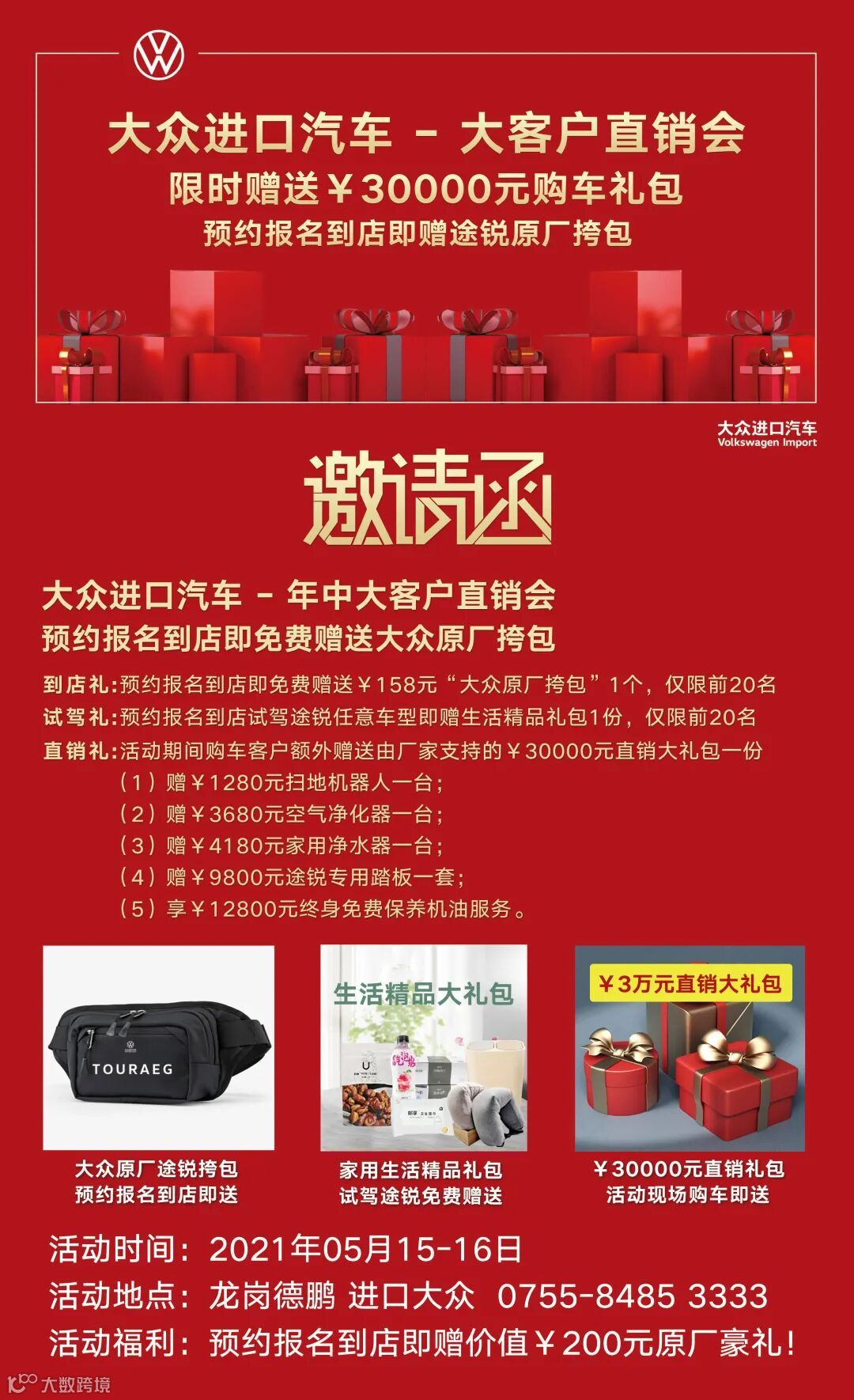预约活动当天进店试驾任意途锐车型客户即可免费赠送精美生活礼品一份
