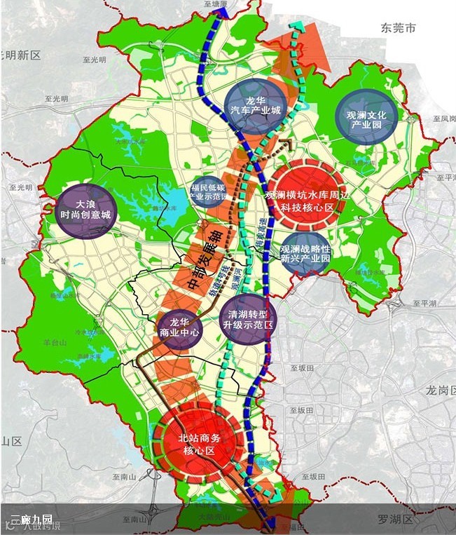 “一中轴九片区”将是未来5年内龙华新区规划和建设的重点。龙华新区将在近5年内力争投入2000亿元,进行大手笔、高标准打造“一个发展中轴、九个功能片区”。