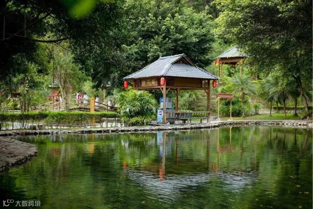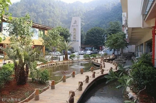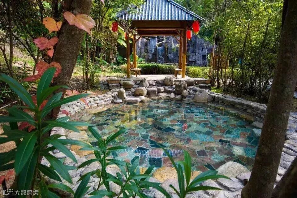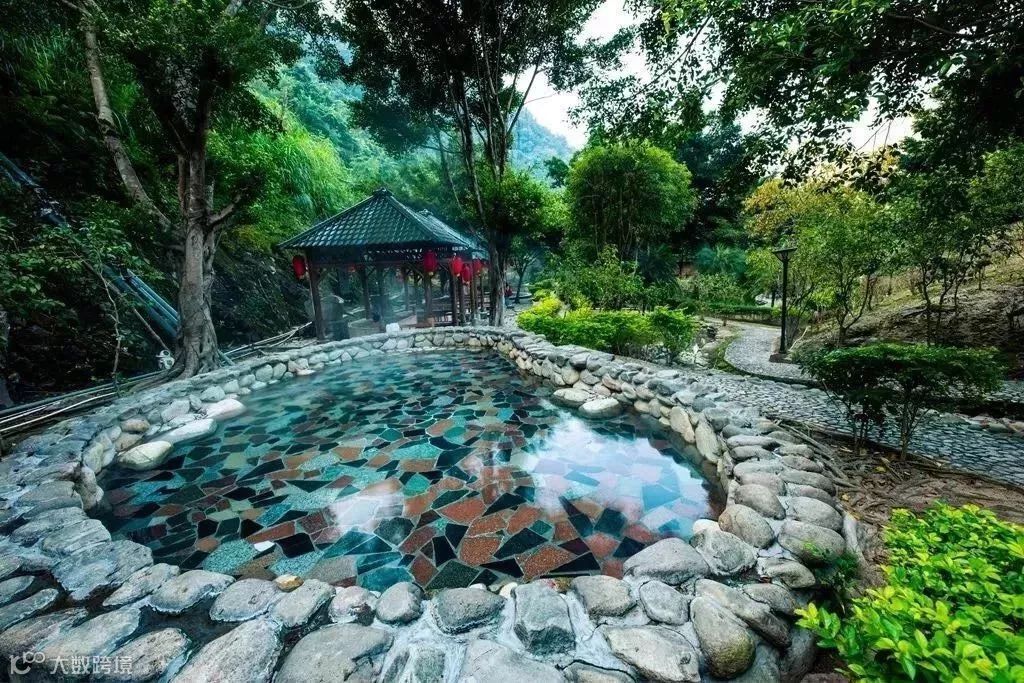 广东第一峰高山温泉酒店依山傍河,有小桥流水,金鱼戏莲、童耍滑梯、休憩竹亭、绿树翠草、那幽静曲折的鹅卵石小路旁,镶嵌着大大小小的游泳池共21个。