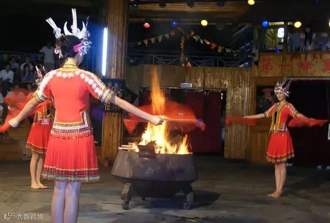 篝火晚会 好一幅古色古香瑶族色彩的画面,大自然的芳馨随着阵阵微风扑面而来,清新、写意!瑶族篝火晚同时容纳400多人同时观看瑶族表演