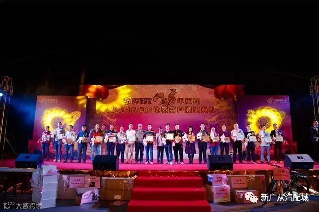 感恩于市场各商户对汽配城经营发展的贡献,特在众商户中评选出18位2016年度的优质商户进行嘉许!在颁奖台上由新广从汽配城总经理张盛先生带领市场经理为18位优质商户进行颁奖,并且一起为全体嘉宾们敬酒,共同祈福全市场商户、各嘉宾在新的一年里大展宏图!生意兴隆!财源滚滚!