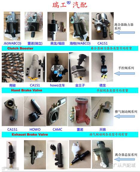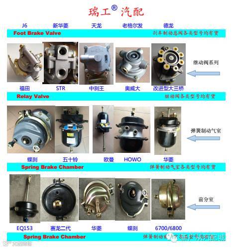瑞工汽配是一家专业销售制动系统气制动泵、阀、调整臂类产品的专业化公司。主营产品有:弹簧制动室、驾驶室举升泵/举升缸、刹车调整臂、高度阀、手控阀、刹车总泵、继动阀、干燥器、快放阀、助力器、卸载阀、感载阀、挂车阀、四回路、排气制动阀、双H阀、取气阀、比例阀、举升阀、控制气阀等各类泵、阀、调整臂类