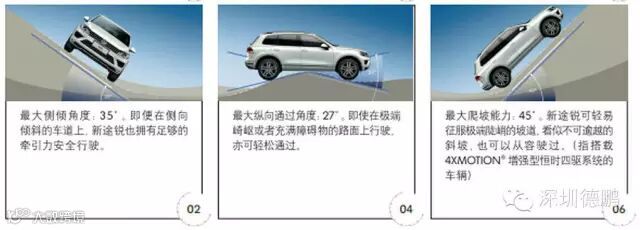 通过性是衡量一款SUV的核心指标,新途锐全系四款车型搭载了带托森式差速器结构中央差速器的4XMOTION®增强型恒时四驱系统,两款高配车型更是装备了4方位调节空气悬架,带电子减震控制,最大爬坡能力45°,最大侧倾角度35°。