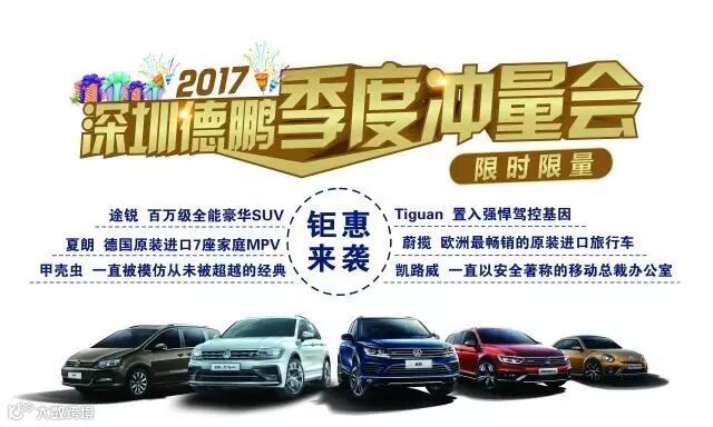 深圳德鹏为完成大众进口厂家第一季度的销售任务,于2017年3月18日在深圳德鹏4S店开展“深圳德鹏季度冲量会”活动。价格一惠到底,春季钜惠仅此一次,活动现场更多重礼遇等着您。