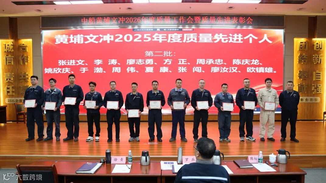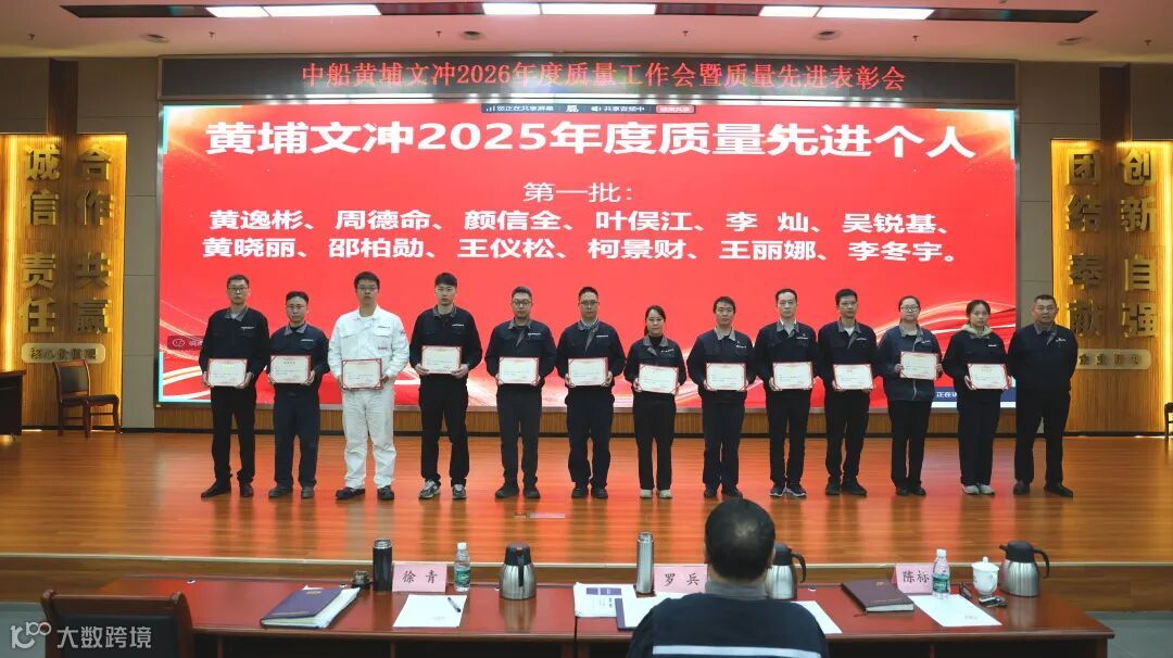 2月10日,中船黄埔文冲船舶有限公司召开2026年度质量工作会暨质量先进表彰会(公司质量委员会会议),会议由公司副总经理、质量委员会副主任徐青主持,公司党委书记、董事长、质量委员会主任罗兵出席会议并讲话,公司质量管理委员会成员、各单位分管质量领导、质量管理人员和受表彰质量先进单位代表及先进个人参加会议。