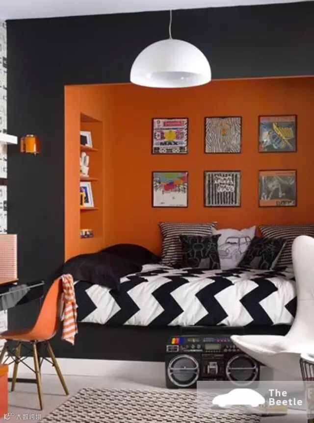 橙色作为卧室墙面的主色调,活泼的动感就打破原本的安静。当这里被橙色占领,暖暖的睡意袭来,舒服的打个盹儿吧。橙色与黑色相搭,更时髦哦。