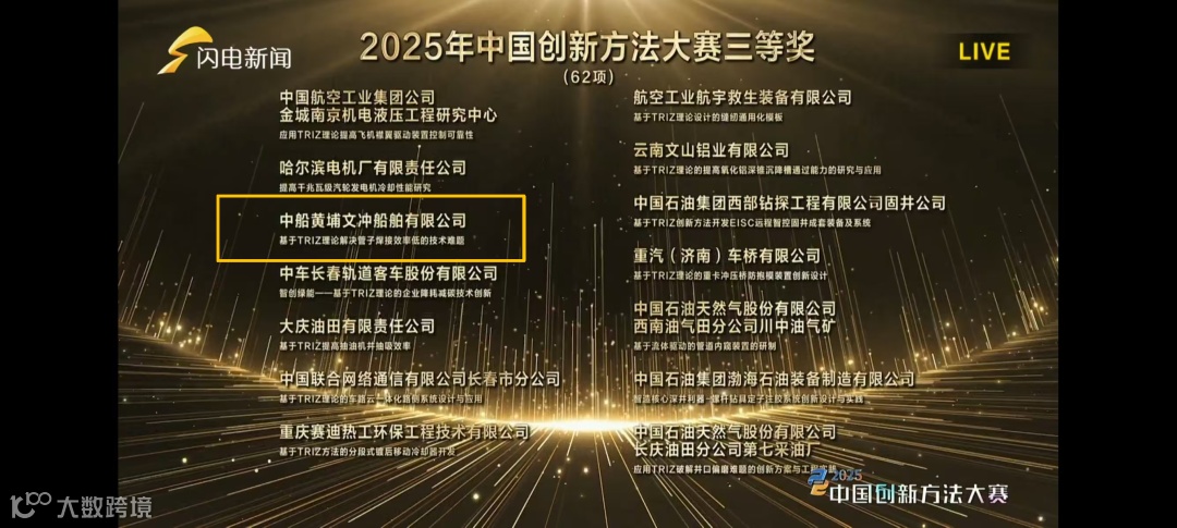 近日,由中国科学技术协会、山东省人民政府主办的2025年中国创新方法大赛总决赛落下帷幕。中船集团旗下中船黄埔文冲船舶有限公司王孟果、曾显涵团队的《基于TRIZ理论解决管子焊接效率低的技术难题》项目代表广东赛区出战总决赛,斩获三等奖。