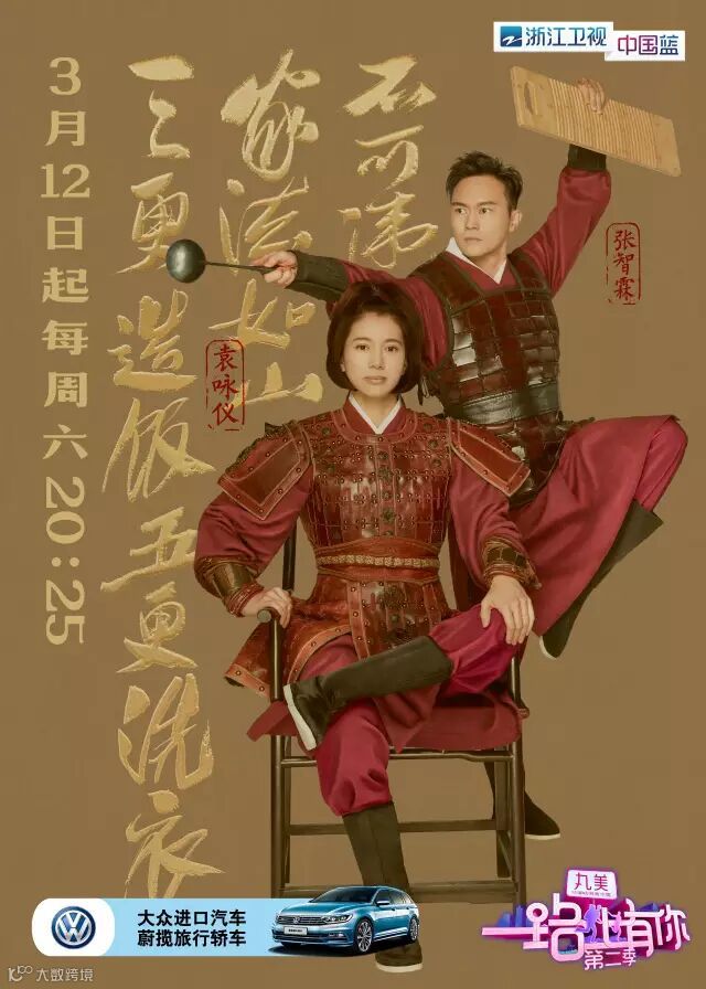 早在节目第一季就积攒下超高人气的“仙靓组合”张智霖、袁咏仪再度来袭! 张智霖化身“家务狂魔”一心只为“花木兰”洗衣做饭,一身戎装却手拿厨具坚定地守护着英姿飒爽的袁咏仪,配上“家法如山”的标语,掩饰不住的欢乐与疼爱。