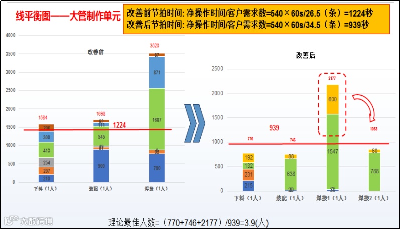 分别测算不同生产单元的生产节拍,按照管子加工主工序弯管、装配、焊接的ΣCT比例来配置工位比例,使前道工序A和后道工序B完成生产任务的工作时间大致相等,管子在工序A完成后能马上到工序B进行作业,实现低库存的等节拍建造。