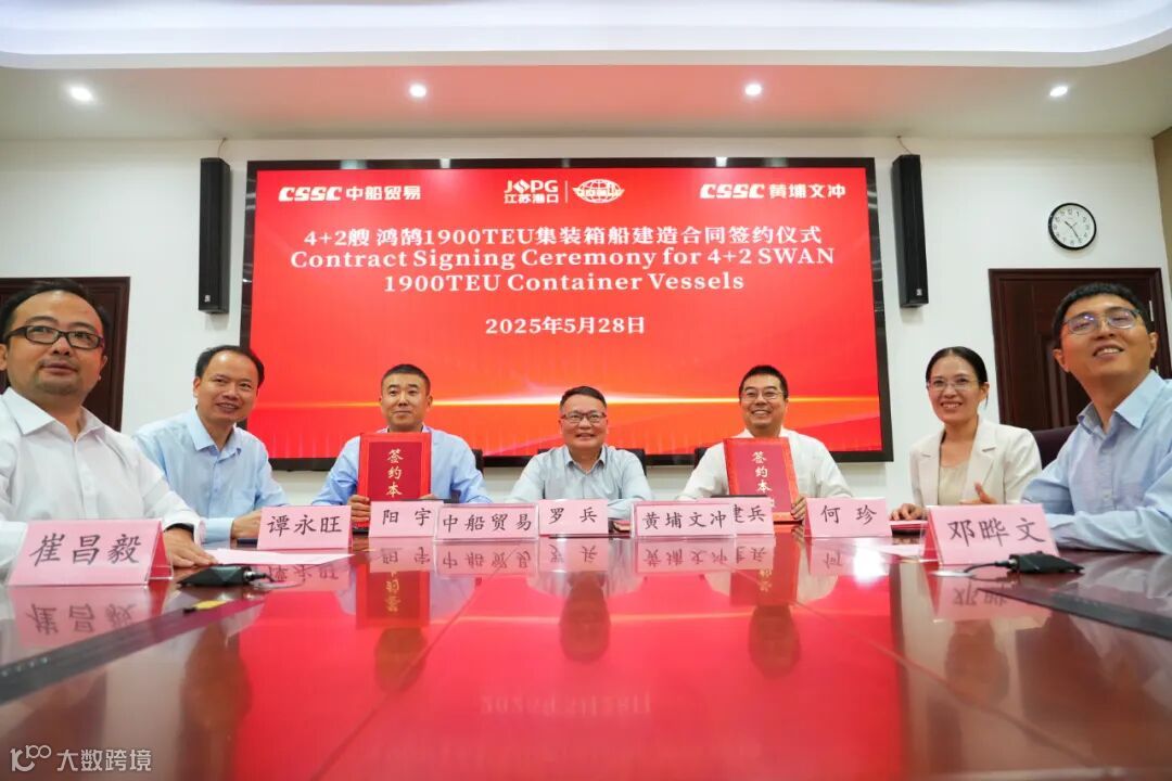 近日,中船集团旗下中船黄埔文冲船舶有限公司(以下简称“黄埔文冲”)联合中国船舶工业贸易有限公司(以下简称“中船贸易”),与江苏省港口集团、江苏远洋运输有限公司(以下简称 “江苏远洋”)举行4+2艘鸿鹄1900TEU集装箱船建造合同线上签约仪式。