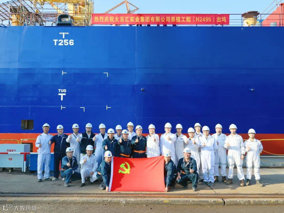 12月17日,中国船舶黄埔文冲为大百汇实业集团有限公司批量建造的10万吨级深远海大型智能养殖工船首制船H2495顺利出坞,与此同时,其姐妹船H2496将即日进坞搭载建造。