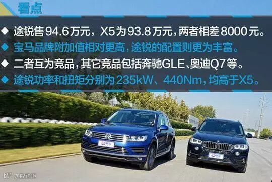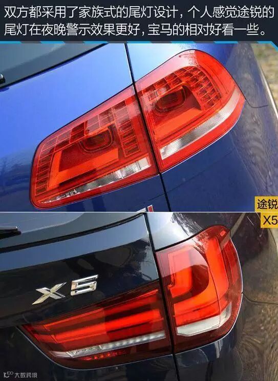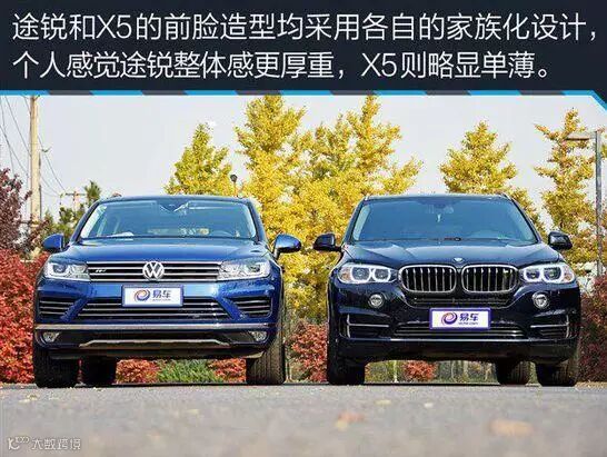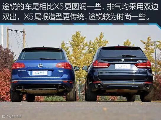 总结:仅就外观而言,途锐和X5各有特点,如果你想选个更值的,那我推荐途锐,丰富的配置是X5没有的,我很承认宝马品牌的诱惑力,但当车主想着自己需要一台长期持有且全能的车,而不是只在城市中;想着前后排要一视同仁,配置都要足够舒适性;想着应该有一辆低调内涵,而不是开出去总觉得被仇视;想着什么时候开心或者不开心,要出去荒山野岭豁一把。那么,大众途锐能满足以上所有需求,这是大众比宝马用心多倍所以值得选择的SUV。