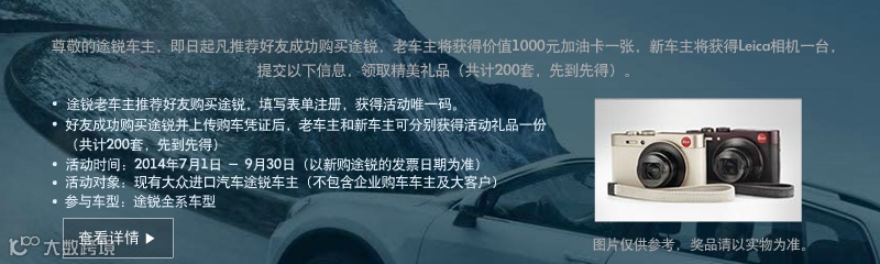 现在,与你的好友一同享受这份超脱的平静!即日起至9月30日,途锐老车主点击文末“阅读原文”,推荐好友成功购买途锐,老车主将获得价值1000元加油卡一张,新车主将获得Leica相机一台。探寻之路,与君同行,共赴巅峰,放飞平静。