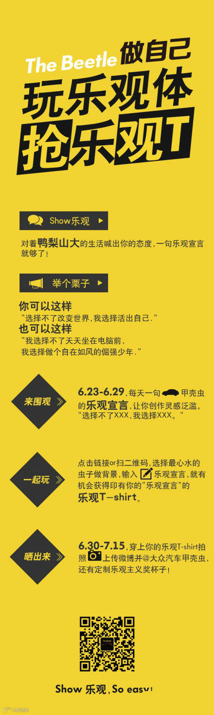 乐观,不需要旋律高亢的励志歌曲,更不需要振奋人心的心灵鸡汤;Show乐观,一句乐观宣言就够了!“选择不了改变世界,我选择活出自己”,没错,就是这种调调!6.23—6.29登录甲壳虫官方微信——大众汽车甲壳虫,以“选择不了_____,我选择_____。”为模板造句,写下自己的乐观体宣言,提交并且分享,就有机会获得印有你乐观宣言的定制T恤。还想赢取乐观主义奖杯子?6.30—7.15,穿上乐观T恤拍照上传微博并@大众汽车甲壳虫,就有机会赢取!