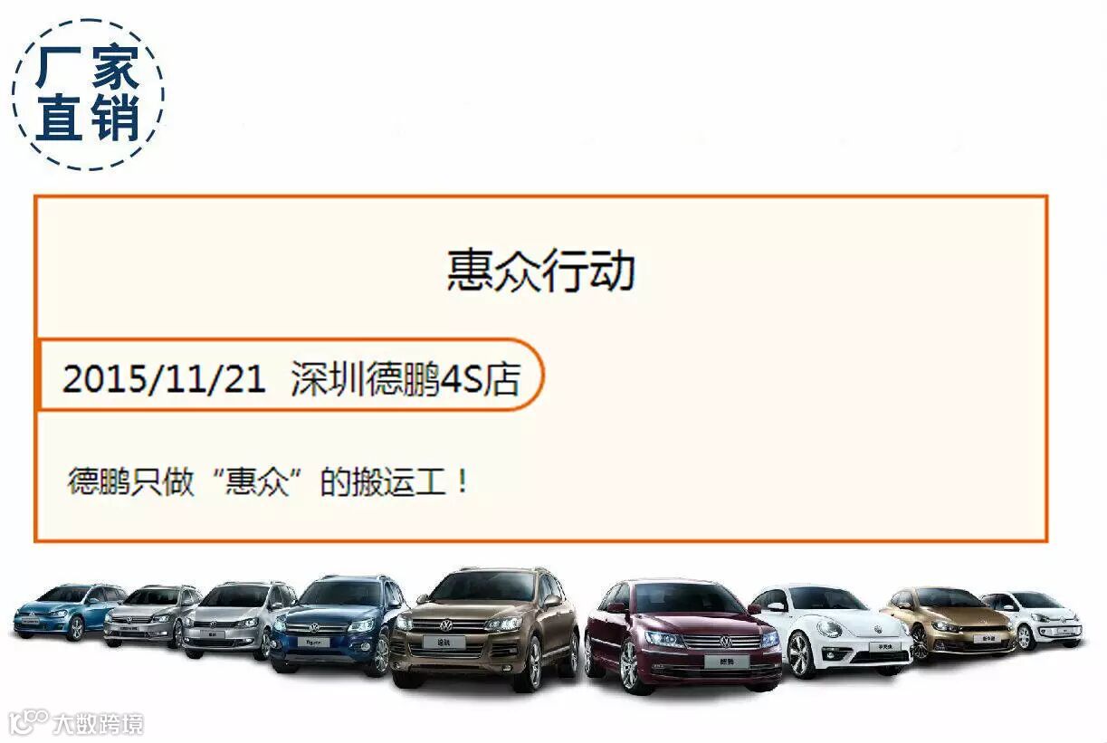 “惠众行动”限时限量直销会是由大众进口汽车厂家全程主办,深圳德鹏协办,将于本月21日在深圳德鹏展厅举行,活动支持、礼品和优惠政策将是全年力度最大的一次,所有的礼品、政策均由大众进口汽车厂家直接提供。这次限时限量直销会是大众进口汽车厂家对区域客户满意度和销量排名前3名经销商的额外厂方奖励支持,深圳德鹏作为全亚洲最大的大众进口汽车经销店,自开业来已经连续2年获得全国最佳新秀经销商称号。非常幸运成为这次活动的协办单位,给德鹏客户到来更多优惠!