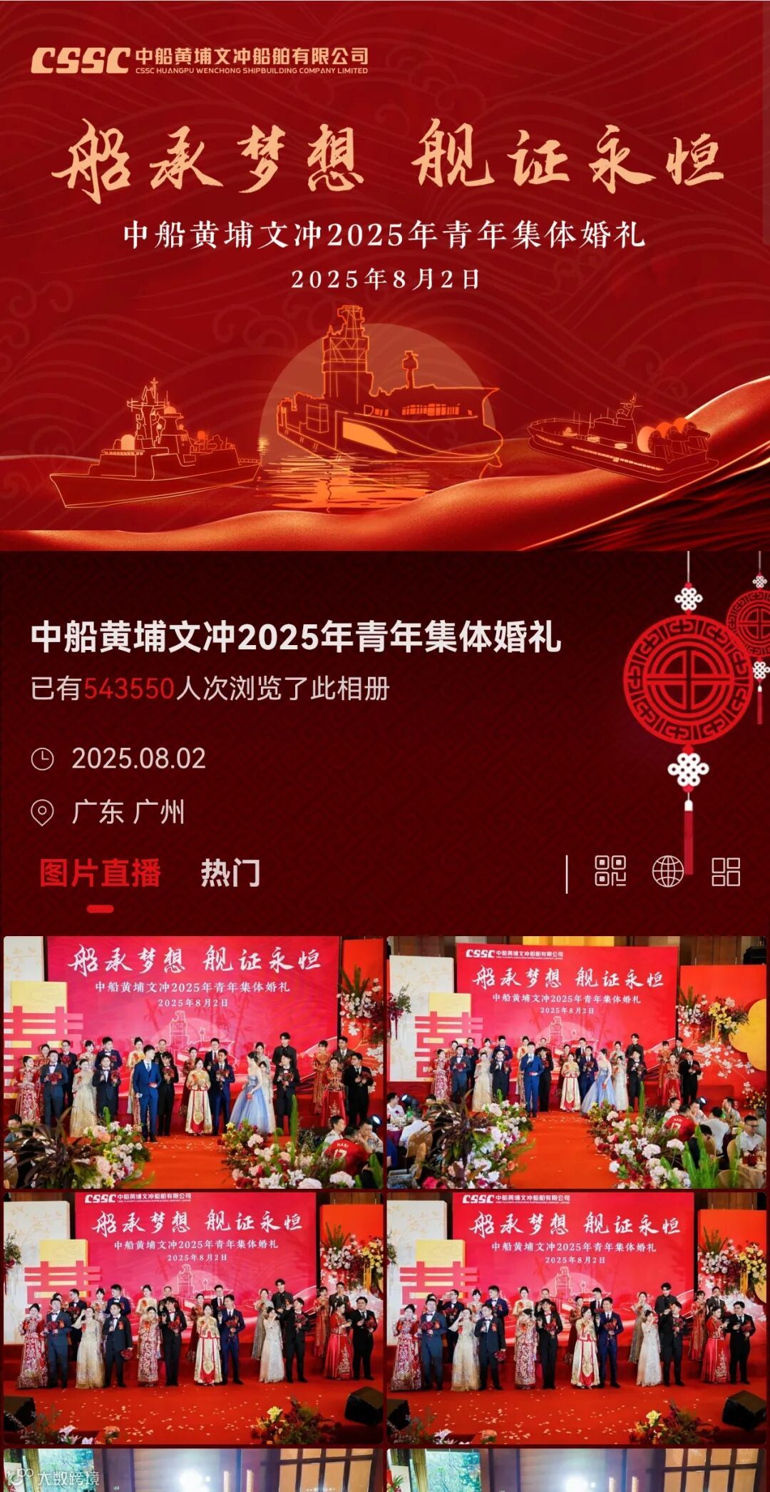 本次集体婚礼通过线上图片直播的形式,邀请企业职工、新人亲朋好友等在线观礼,婚礼直播通道浏览量超50万人次,成为朋友圈热议和刷屏的浪漫“新闻”。