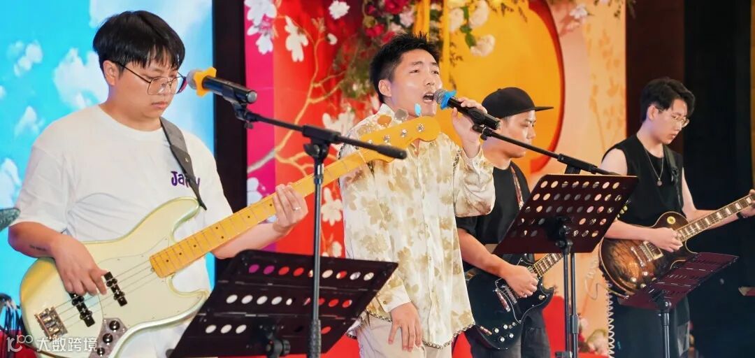 吉时已至,一段充满幸福与浪漫的新人寄语VCR与快剪视频,拉开典礼序幕,更有乐队现场演奏,点燃婚礼气氛。