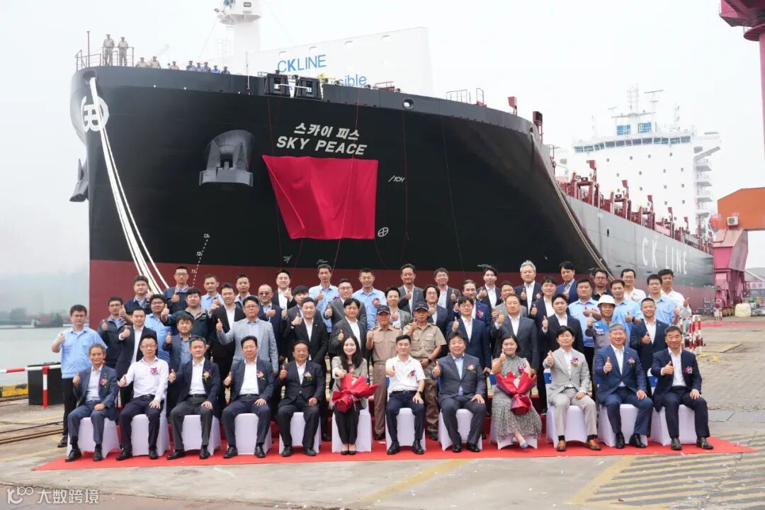 在来宾的共同见证与祝福下,H2531船被命名为”SKY PEACE”轮、H2532船被命名为“SKY PRIDE”轮。