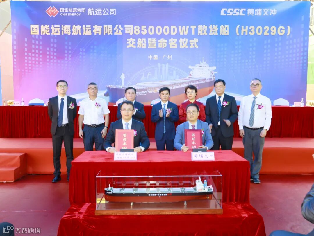 国能远海副总经理周长根对公司的建造品质、效率予以高度肯定,黄埔文冲副总经理徐青代表公司感谢国能远海的信任,希望双方后续能继续加强合作。陈雷、段鹏飞分别代表黄埔文冲、国能远海在交船文本签字。