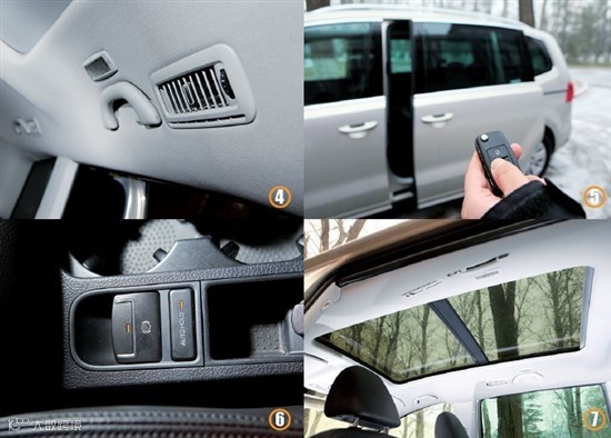 7.全景天窗提升了新夏朗的乘坐舒适感,由于天窗面积很大,可以照顾到第二排乘客,所以即便在3人同时乘坐时,也会因为头顶的通透,让拥挤感减弱。