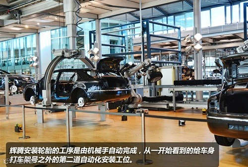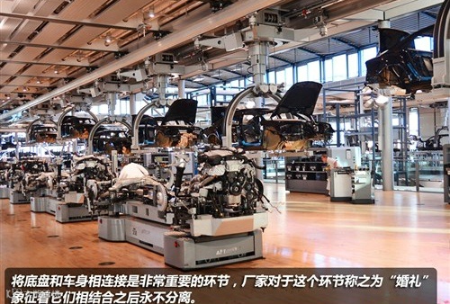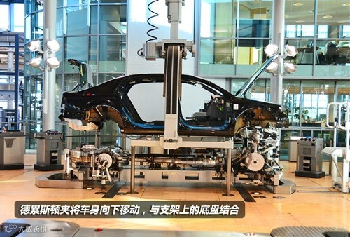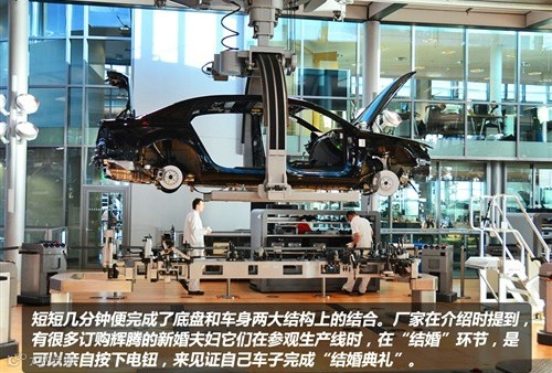 安装车身的基本设施后,就到了安装底盘悬架和动力系统的环节,辉腾的动力系统和悬架总成与车身相结合的步骤被称之为“结婚”,象征着它们结合之后永不分离。厂家在介绍时,还提到有很多订购辉腾的新婚夫妇它们在参观生产线时,在“结婚”环节,是可以亲自按下电钮,来看着自己车子完成“结婚典礼”。