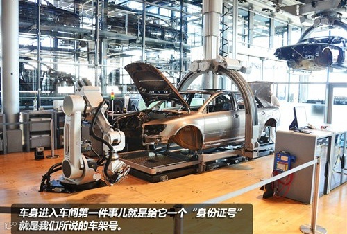 知道了辉腾的配件是如何运送到透明工厂之后,下面该正式开始我们对生产线的参观了。每辆辉腾的车身在运送到工厂的第一件事儿就是发给它一个“身份证号”,即车架号。完成编码后,便开始了它的总装,每层的生产线成环形围绕,完成一层的所有工序之后,会由车顶的吊环把它运送到下一层的环形生产线上。整个生产线顶部的轨道称之为EHB(电动悬挂轨道),辉腾在工厂里所有的移动都是靠它完成的。