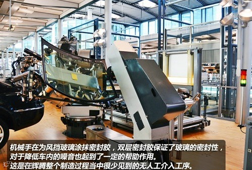 外观上的基本装配完成之后,进入到安装轮胎和前后风挡玻璃的环节,这两个环节也是在整个参观过程中为数不多可以见到自动化生产的工位。整个步骤均有电脑独立完成,厂家介绍,辉腾整个装配环节的手工工艺达到了97%