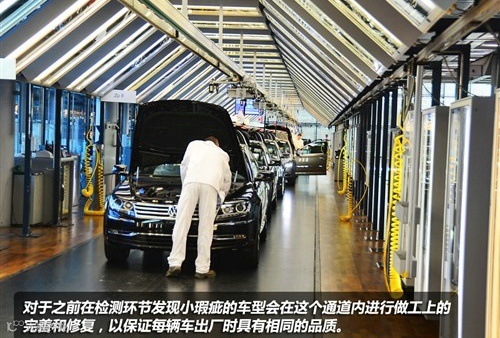 对于任何细节上的瑕疵,都会被检查出来,甚至于连内饰的安装接缝都要进行统一的检查。当有任何小的瑕疵出现,都会在车身上标识出来。上图被画出的白色区域是专业工程师检查出有问题的地方,不过,这个部分我看了很久都没看出来,也许是我太初级了!当出现问题,会把这辆车送到相关的生产部门,进行返工或者修复处理。对于如此细致的检查让我对大众工厂工程师严谨的工作态度非常钦佩。