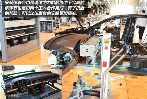 安装仪表台便是第二层的第一道工序,安装时同样需要助力机协助完成,使用这种设备基本两个人就可以独立完成,有了机器设备的帮助,仪表台安装的位置和装配工艺也更加精准。安装内饰部件之后,车辆将被再次吊起,准备进行底盘和车身相结合的工序。