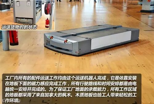 需要装配的零配件由运送机器人送到相应的位置上,整个过程完全不需要人工介入。运输机器人的行迹路线是通过对地板下面的磁力感应点来完成的,所有安排均有电脑自动进行设置。工厂内的所有地板均采用了来自加拿大的枫木,这种木质具有更强的抗压和抗磨能力,并且木质地板也给工人带来更加轻松的工作环境。