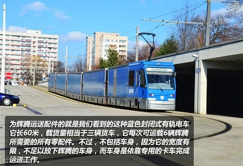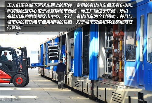 用于辉腾的所有零配件会各地统一运往位于德累斯顿市西边的物流中心,运往透明工厂的交通工具就是我们现在看到的蓝色有轨电车,该电车为全封闭式,并且通过城市轨道穿行于德累斯顿市区,走在德累斯顿的街头很有可能会看到它,它使用城市的轨道交通也表现出了大众对于环保方面的态度。每辆货车里面装载着6辆辉腾所需要的所有零配件,每天的运送次数在6-8趟。