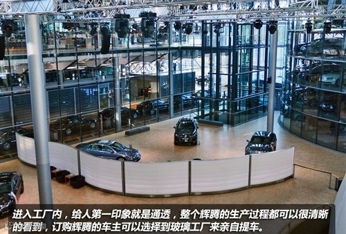 由于每一辆辉腾都是按照客户自己的要求定制的,所以,在同时生产的辉腾没有哪两辆是完全相同的。这一些都表现出了在程序化的生产模式之外,定制造车的方式和理念。停车楼左侧白色的建筑物便是辉腾的定制中心和提车大厅。