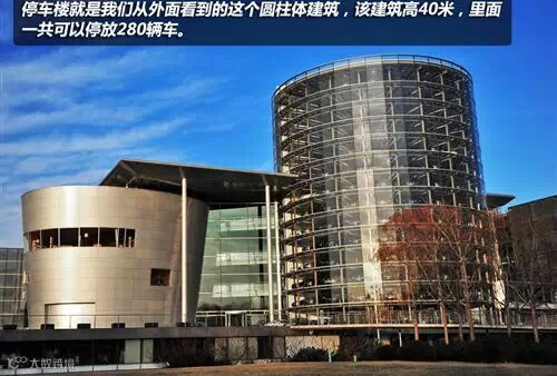 停车楼就是我们从外面看到的这个圆柱体建筑,该建筑高40米,里面一共可以停放280辆车。左侧银色建筑下面就是辉腾的提车区,当车主来提车,所属车辆会通过地下电梯直接运送到提车大厅。