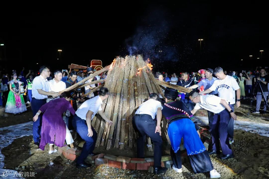 随着吉祥火把的点燃,动情乐曲的奏响,现场身穿民族服饰的群众,手牵手围绕着篝火跳起了欢快的舞蹈,见证了一场百人“玩火”的狂欢。