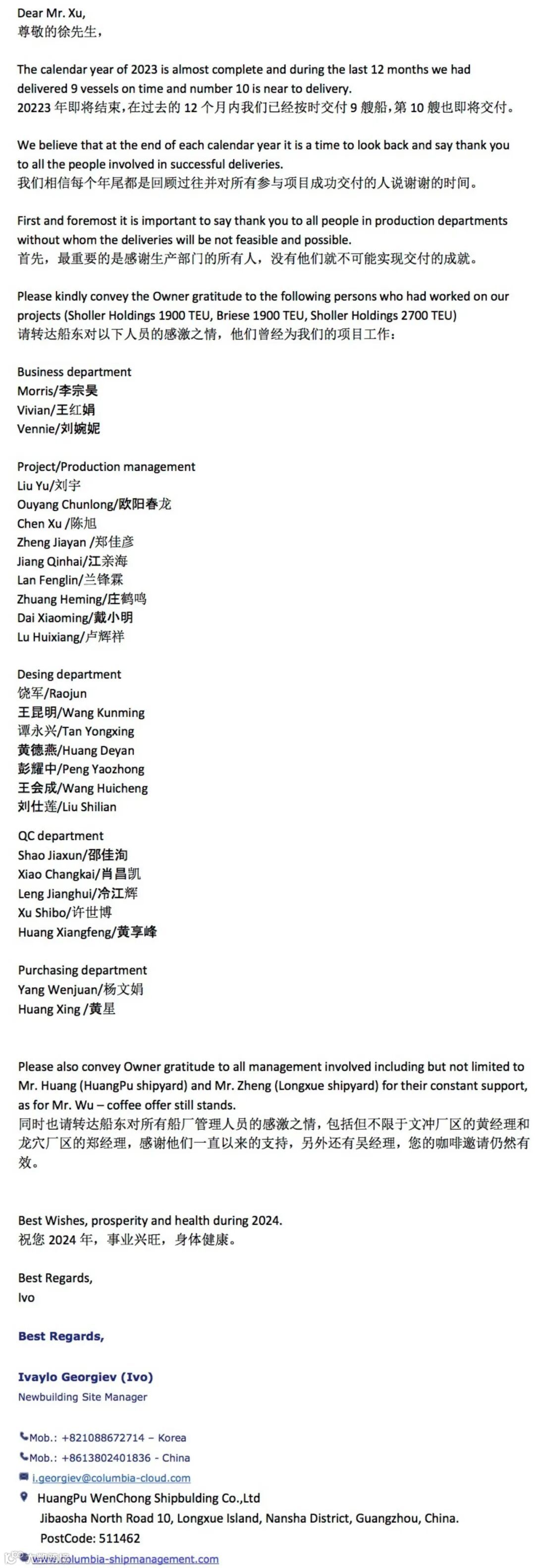 近日,公司收到来自Schoeller Holdings公司船东监造经理Ivo的感谢信。
