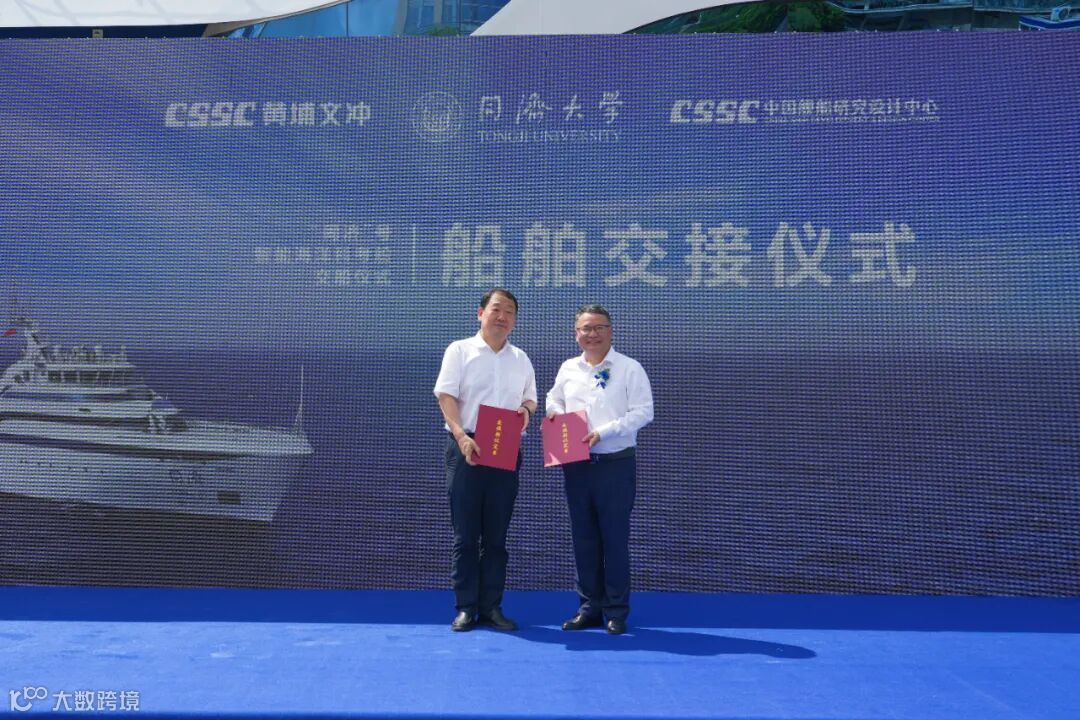 交船仪式上,罗兵、石振明分别代表中船黄埔文冲和同济大学交换交船文件,标志着“同济”号正式交付。