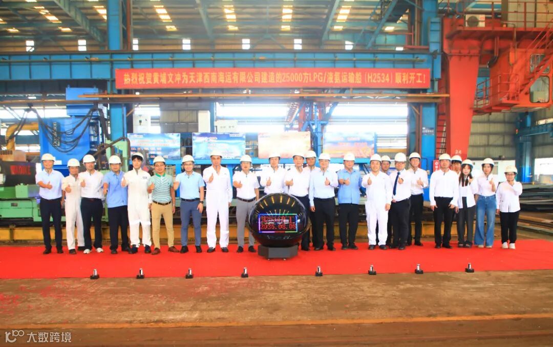 同日,黄埔文冲与天津西南海运再度携手,联合中国船级社等相关单位,共同为 25,000 方氨双燃料 LPG / 液氨运输船2号船(H2534)举行开工仪式。