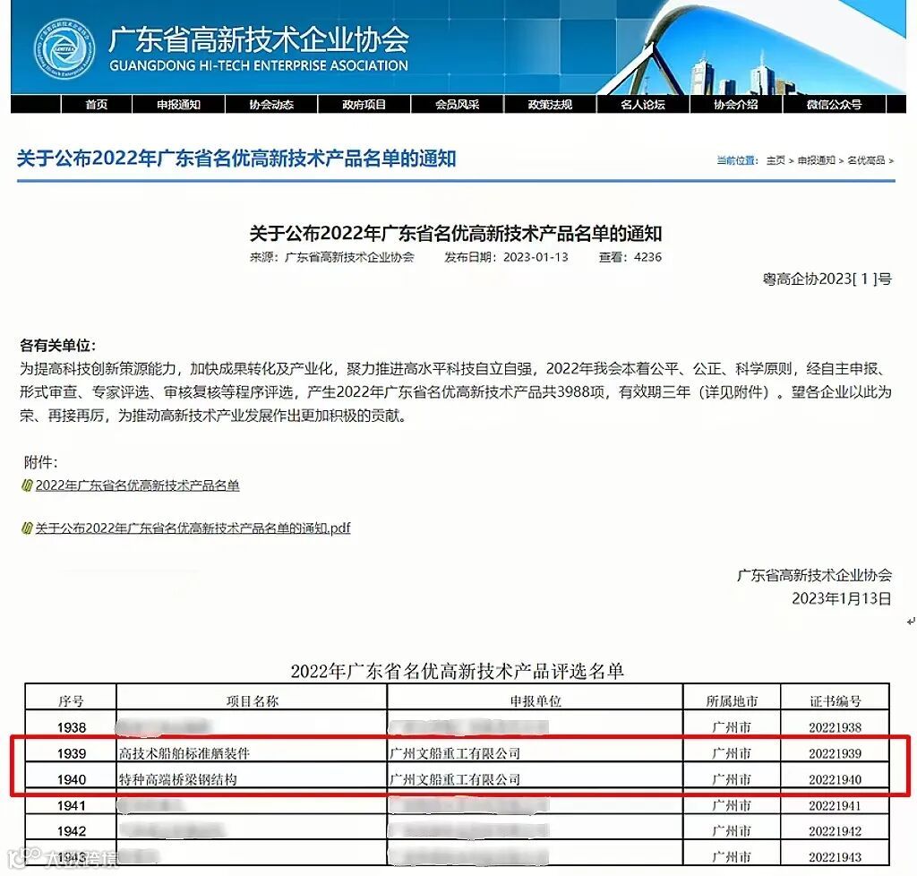 与此同时,重工公司高技术船舶标准舾装件、特种高端桥梁钢结构双双入选《2022年广东省名优高新技术产品名单》。