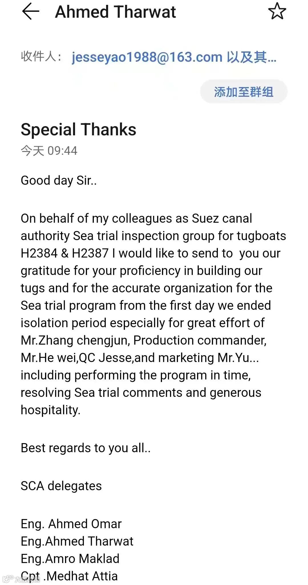 同日,公司收到来自船东的感谢信。两船冲刺交船阶段,正值广州遭遇最严峻疫情,项目组在科学防疫的基础上,紧抓生产,确保两船按船东预期交付。