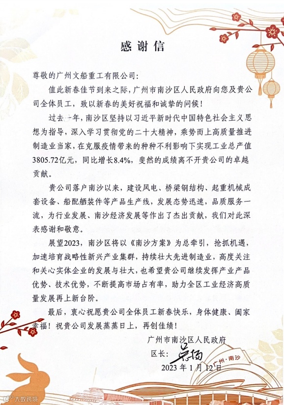 市南沙区人民政府向公司下属广州文船重工有限公司发来了感谢信,对该公司2022年为南沙区经济发展做出的努力和贡献,表达了高度赞扬与感谢。