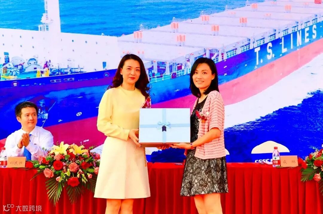 成琳为该船命名后,公司向教母送上鲜花,现场一派喜气。