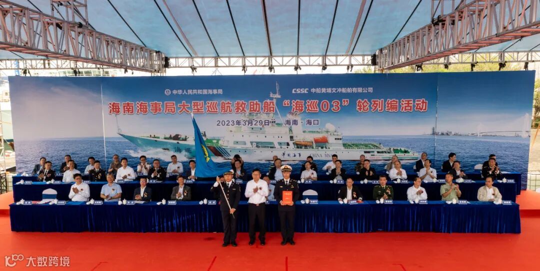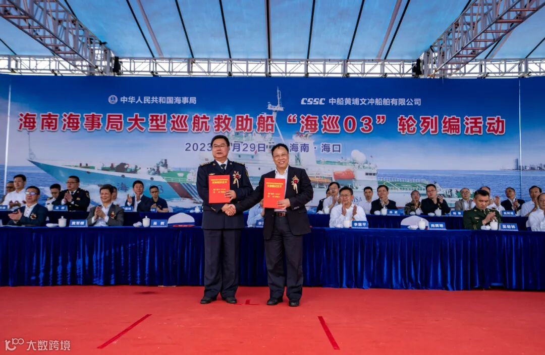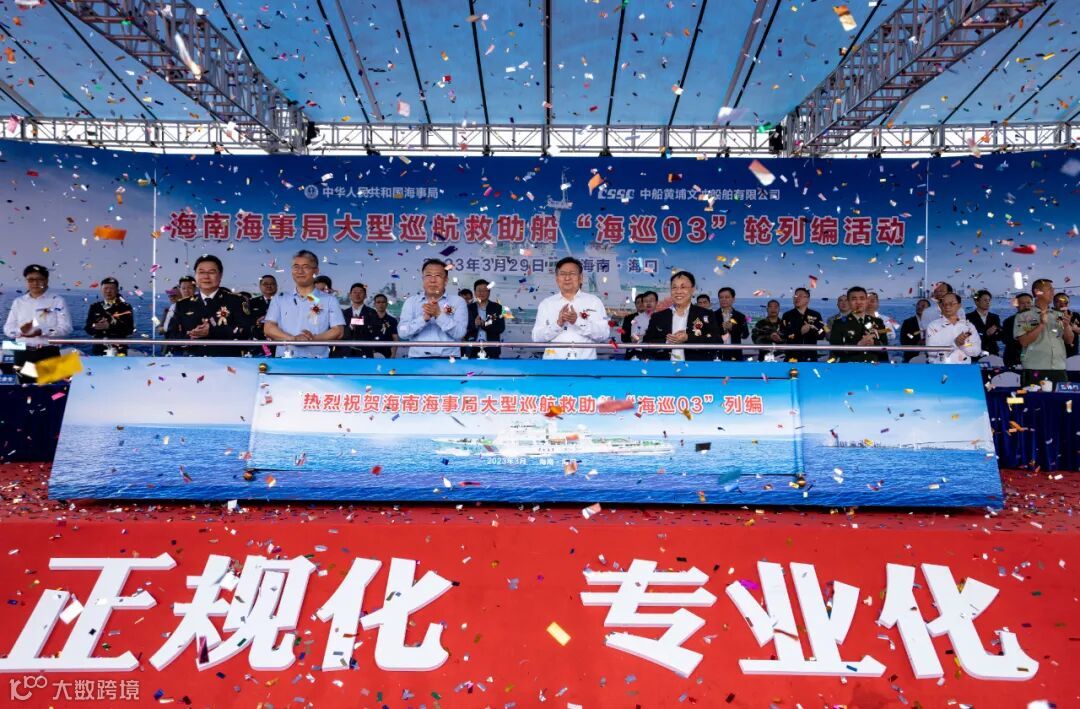 3月29日,中国船舶集团属下中船黄埔文冲船舶有限公司为交通运输部海事局建造的大型巡航救助船“海巡03”轮在海口正式列编海南海事局。