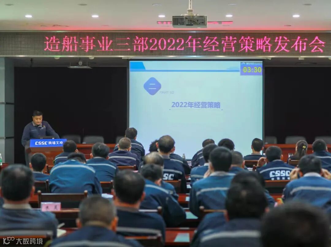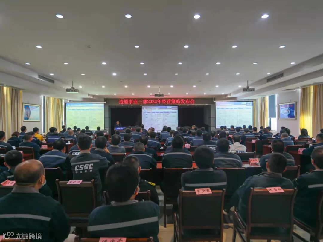 为传达中国船舶黄埔文冲2022年度经营策略发布会会议精神,总结分析造船事业三部2021年全年工作,部署2022年重点工作。1月14日下午,造船事业三部召开2022年度经营策略发布会。造船事业三部基层副职以上管理人员,各产品船项目经理,部分劳务工程负责人及相关业务主管参加了会议。黄埔文冲总工程师李东,总经理助理陈标烘、徐青、李凯、许燕、韩建兵应邀出席会议。
