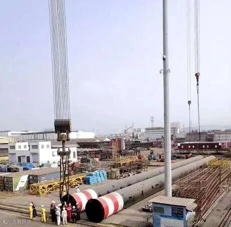 钢桩直径2.2米,长度57.2米,重207吨/根(共有主/辅两条钢桩),这一体型,为此次任务带来了三大难点。一方面在于钢桩尺寸大,但吊装后与船体上下抱箍单边仅10mm,对钢桩直线度精度要求极为严格;另一方面在于这一长度要吊装到距船体基线27米高的钢桩台车上定位安装,对于吊车的吊幅要求比较高,公司现有吊车资源难以满足;此外,圆柱形的钢桩顶部仅一个结构吊点,钢桩下部为圆锥结构,整个钢桩外表面不能增加额外辅助吊点,如何安全顺利将这个超大型钢桩翻成竖直状态,对吊装操作是一个极大的考验。